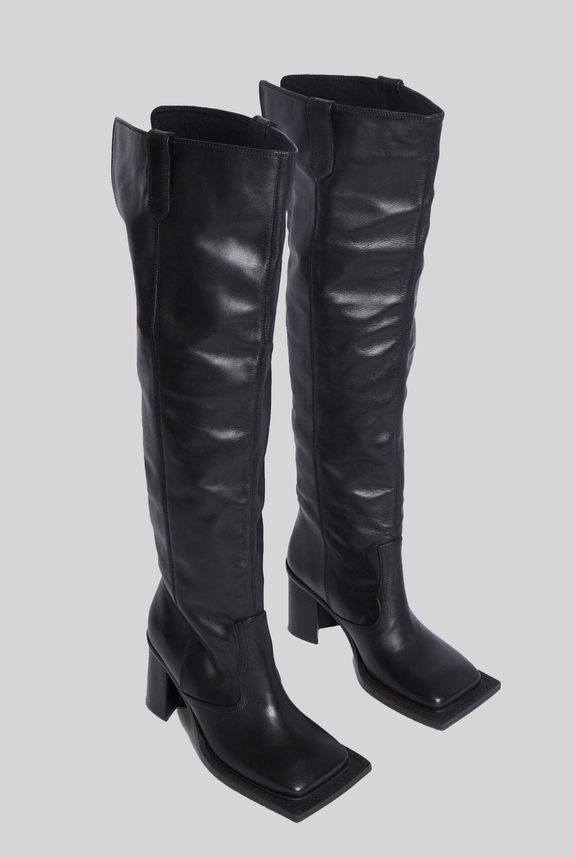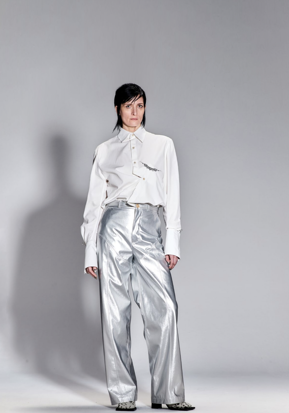 Predators will often attack the most sensitive part of their prey; the groin. In an act of vulnerable defiance, Ninamounah introduces hipbone-baring trousers in Nappa leather, denim, and virgin wool.